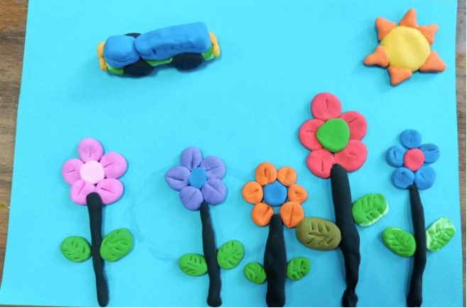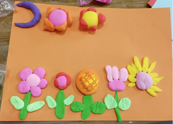 对于低龄学生,课程核心在于激发兴趣与基础形态认知。志愿者通过趣味互动导入,引导学生观察并制作太阳、花朵等基础图形。针对表达受限的学生,志愿者采用非语言引导与正向鼓励相结合的方式,鼓励他们从搓圆、压扁到组合造型,当小手渐渐熟练,黏土便插上了想象的翅膀,层层叠叠的小花、爱吃的草莓蛋糕、酷酷的小汽车、立体的卡通人物在孩子们手中悄然诞生,孩子们小手沾满了各色黏土,脸上绽放的笑容比作品更加灿烂。