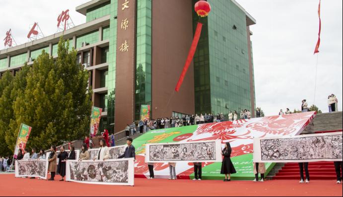 为贯彻学校美育工作实施方案,助力艺术校园建设,更好的传承和弘扬传统文化,淄博师专于10月26日下午在杏坛广场隆重举行“手随心动,剪随你行”第五届剪纸活动周开幕式。本次活动由美术系、科研处主办,王继红剪纸艺术工作室承办,宣传统战处、团委、学前教育学院协办。学校党委书记于军、校长孙启友及其他党委班子成员、各处室主要负责同志和学校爱好剪纸的师生们共同参加了此次活动。开幕式由美术系党支部书记梅玉洁主持。