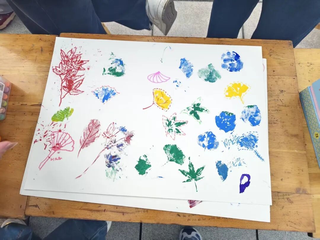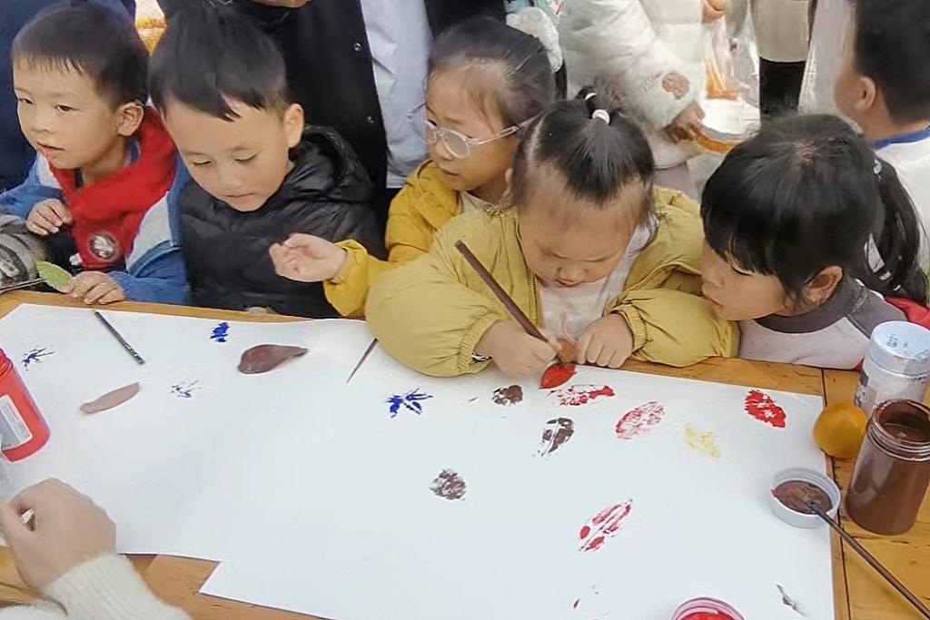 美术系还在活动现场设置了涂鸦互动体验区。在志愿者的耐心指导下,学校各院系的同学们和附属幼儿园的孩子们尝试进行柿子树叶拓印和简易柿子图案涂鸦。现场创作的作品在现场展架上同步展示。