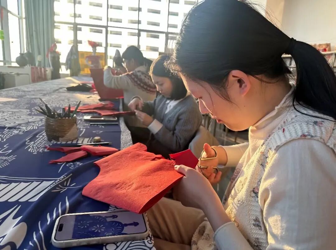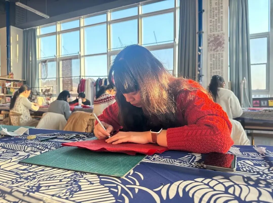 1月12日,在民间美术工坊的“植绒纸剪纸云肩体验”活动中,王继红老师从云肩纹样的设计构思,到植绒纸的裁剪、镂空、装饰,每一步都手把手指导。师生们发挥创意,结合现代审美对传统云肩纹样进行改编,制作出风格各异的云肩剪纸作品,在动手实践中感受传统服饰纹样与剪纸艺术的融合之美,沉浸式体验非遗技艺的创作乐趣。